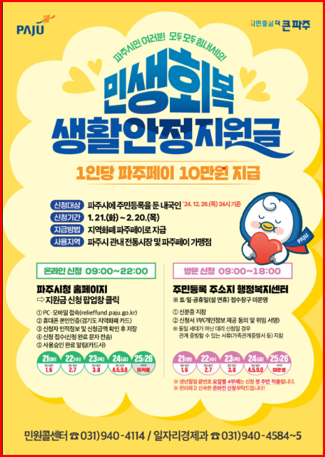 파주시 홈페이지에서 온라인 신청도 되고 주소지 행정복지센터에서도 신청이 되니 신청기간 안에 꼭 신청하셔서 지원금을 받으시기 바랍니다.