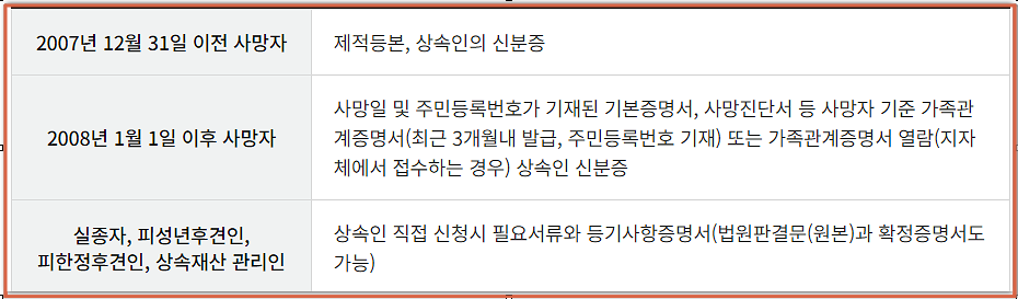 ▷ 상속인 등이 직접 신청할 경우 필요한 서류